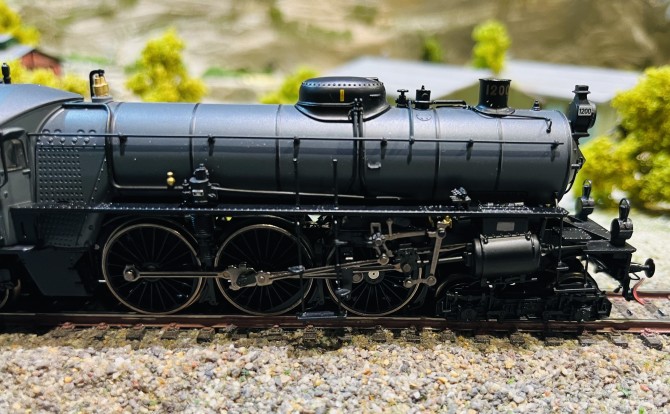 Ein eleganter Anblick. Der graue Kessel und die roten Schienenräumer mit roten Pufferbohle.