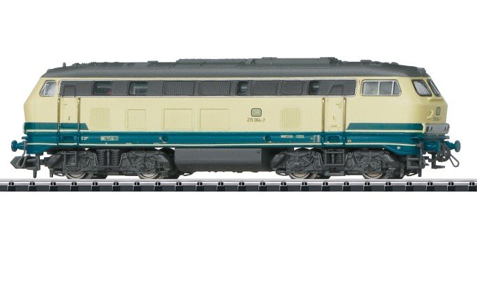 Neben vielen anderen Aufgaben zogen diese Lokomotiven oft auch Reisezüge mit regionalem Charakter. Diese 215 trägt (erstmalig im MINITRIX-Programm) die in den 1970ern eingeführte Farbgebung ozeanblau/elfenbein.