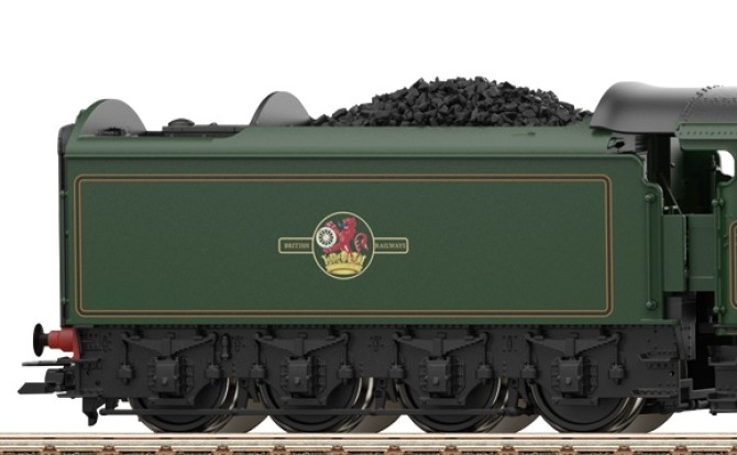 Aktueller Betriebszustand im Aussehen von 1963 mit Korridor-Tender und Windleitblechen, so wie die Lokomotive derzeit betriebsfähig im National Railway Museum in York beheimatet ist.